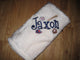At the bottom center of the blanket, the baby's names are embroidered in a darker pink thread.  Beneath the names is a lilac-colored ribbon.  You may choose the color for the embroidery thread and the blanket color.  The blanket comes in the following colors: baby blue, baby pink, and natural.  Just let me know the color you would using the drop-down box.  Choose from the thread color chart.  Be sure to include the names for the baby.