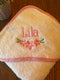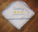 How adorable! This hooded towel is made of quality white terrycloth is 34” x 34”.   It is trimmed with blue and white striped fabric.  The towel is embroidered with the child's initials as the head of the whale.  The rest of the whale's body is stitched in coordinating blue embroidery...
